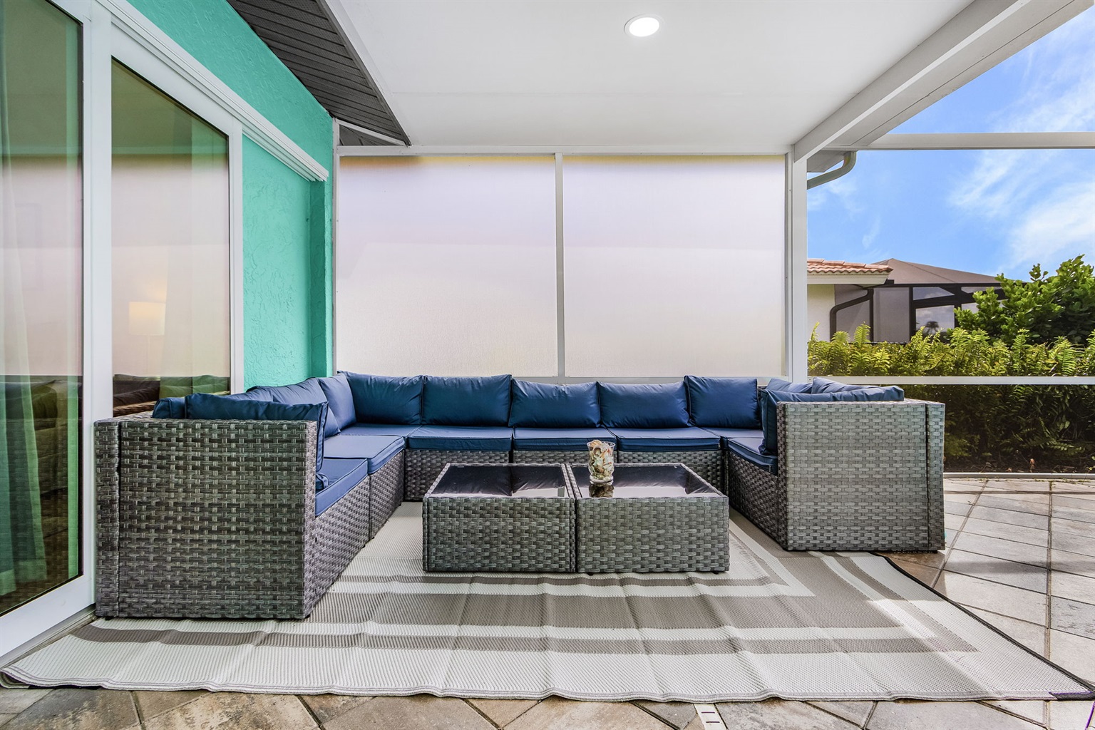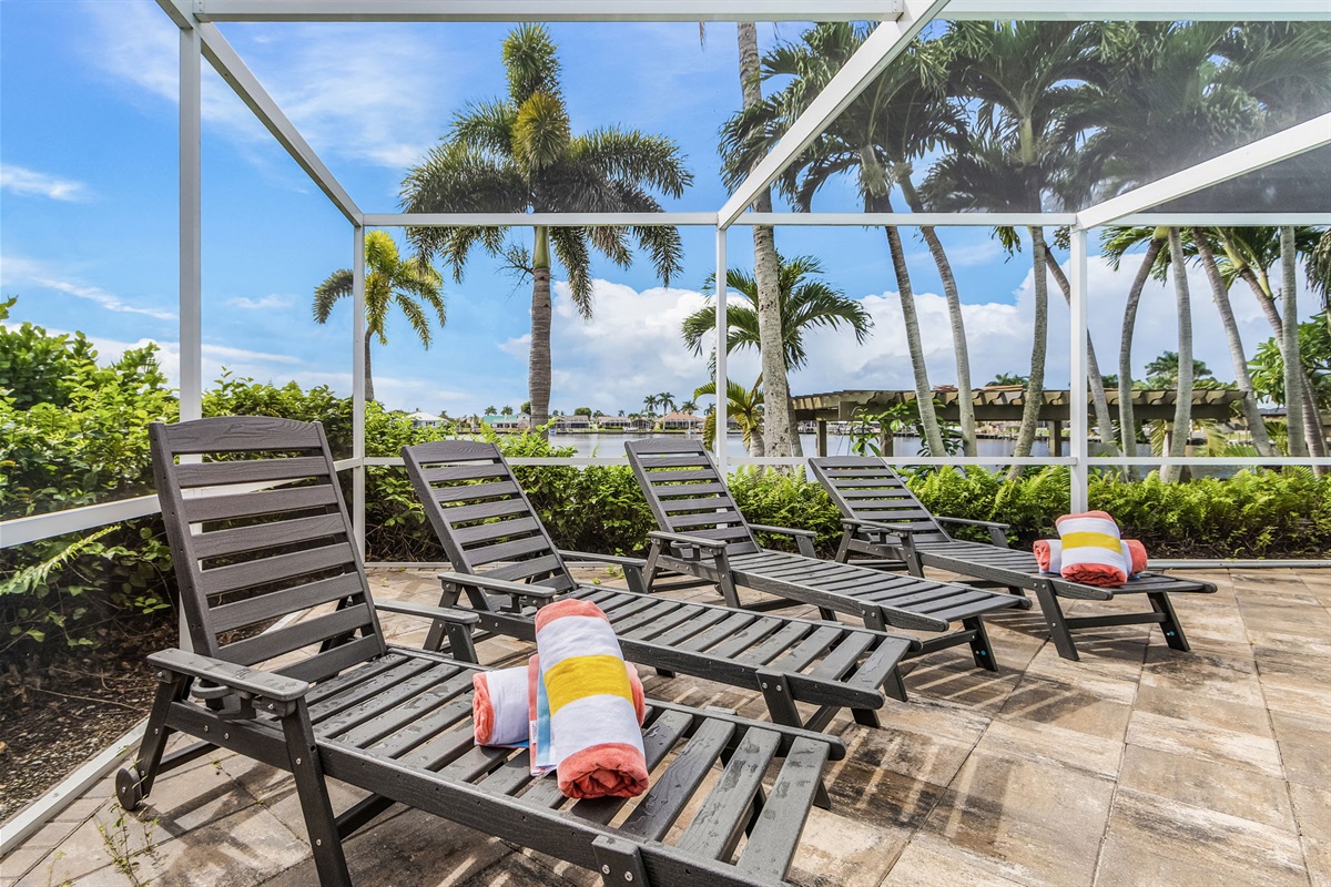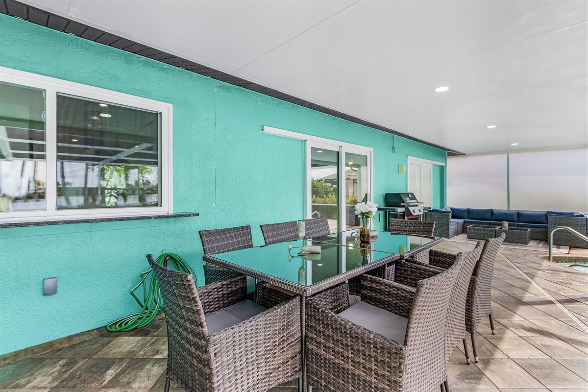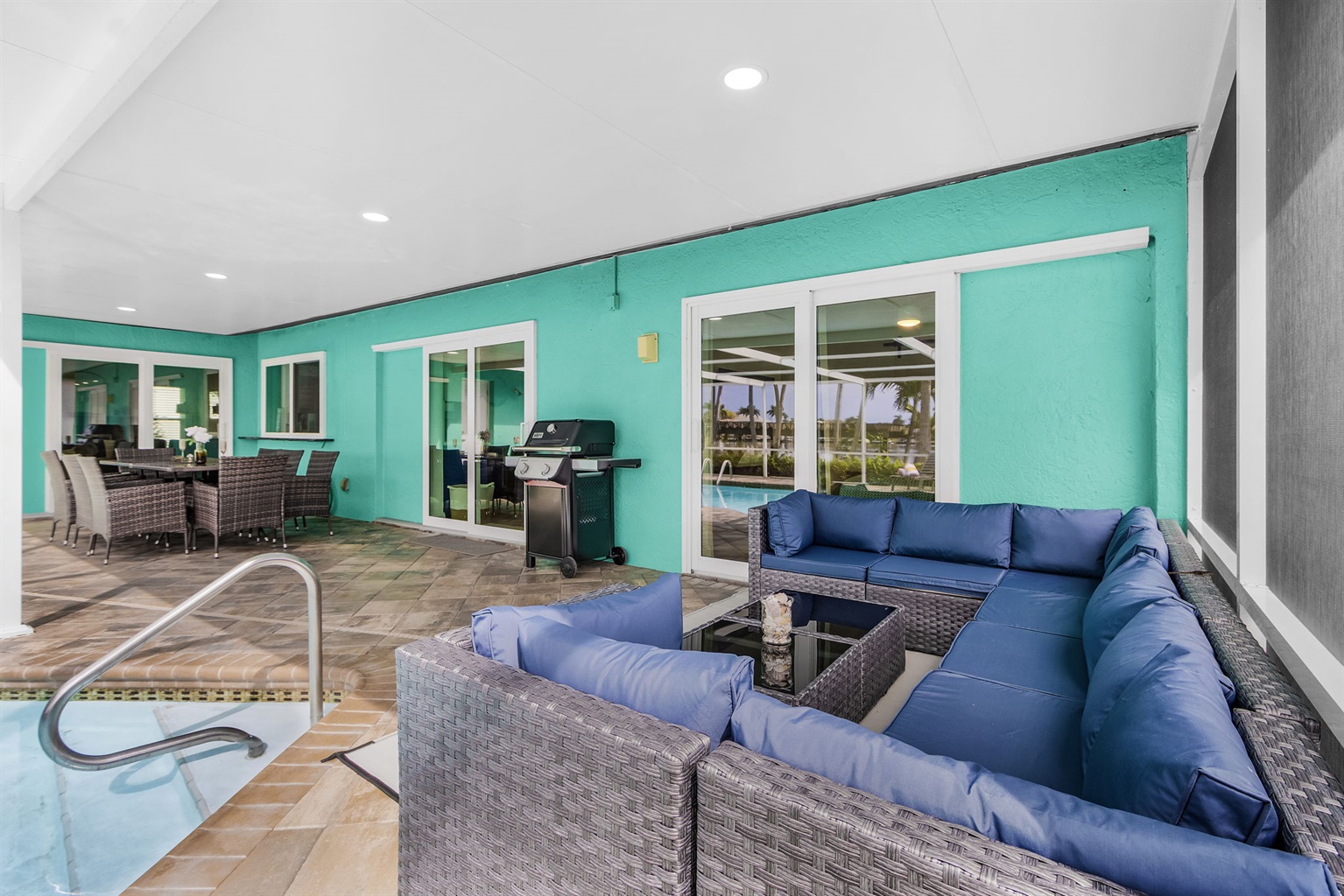 Spacious lanai with plenty of lounge chairs, seating areas, and a BBQ station