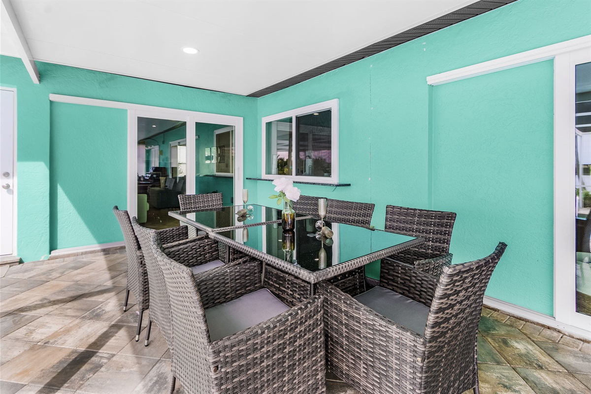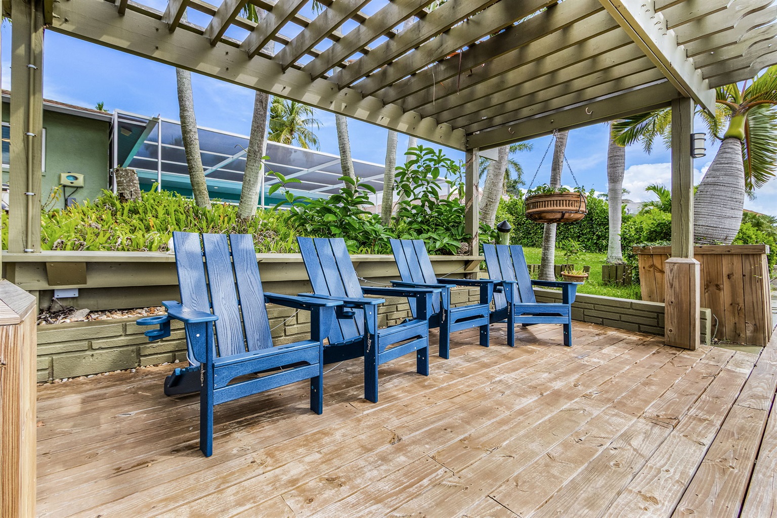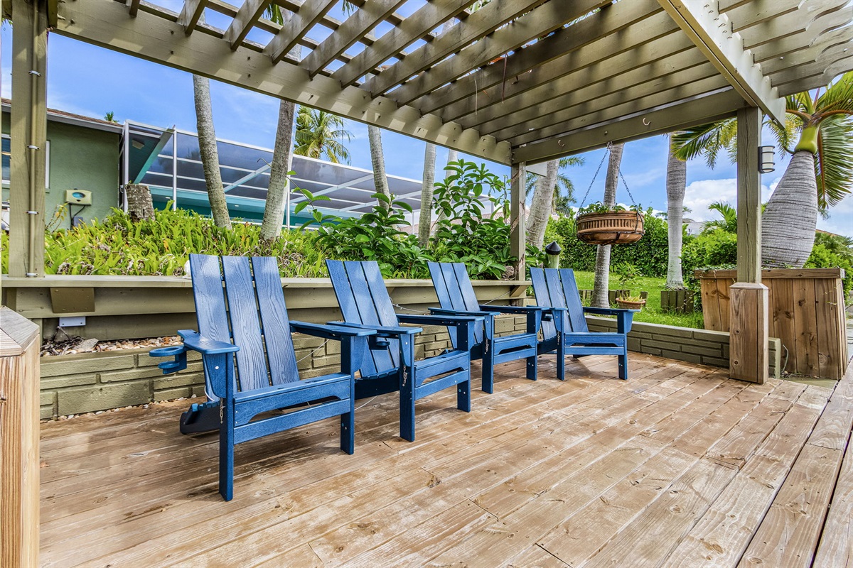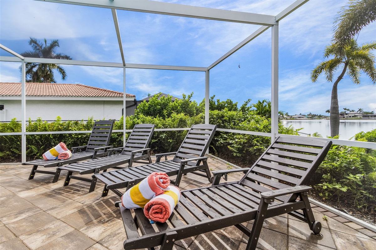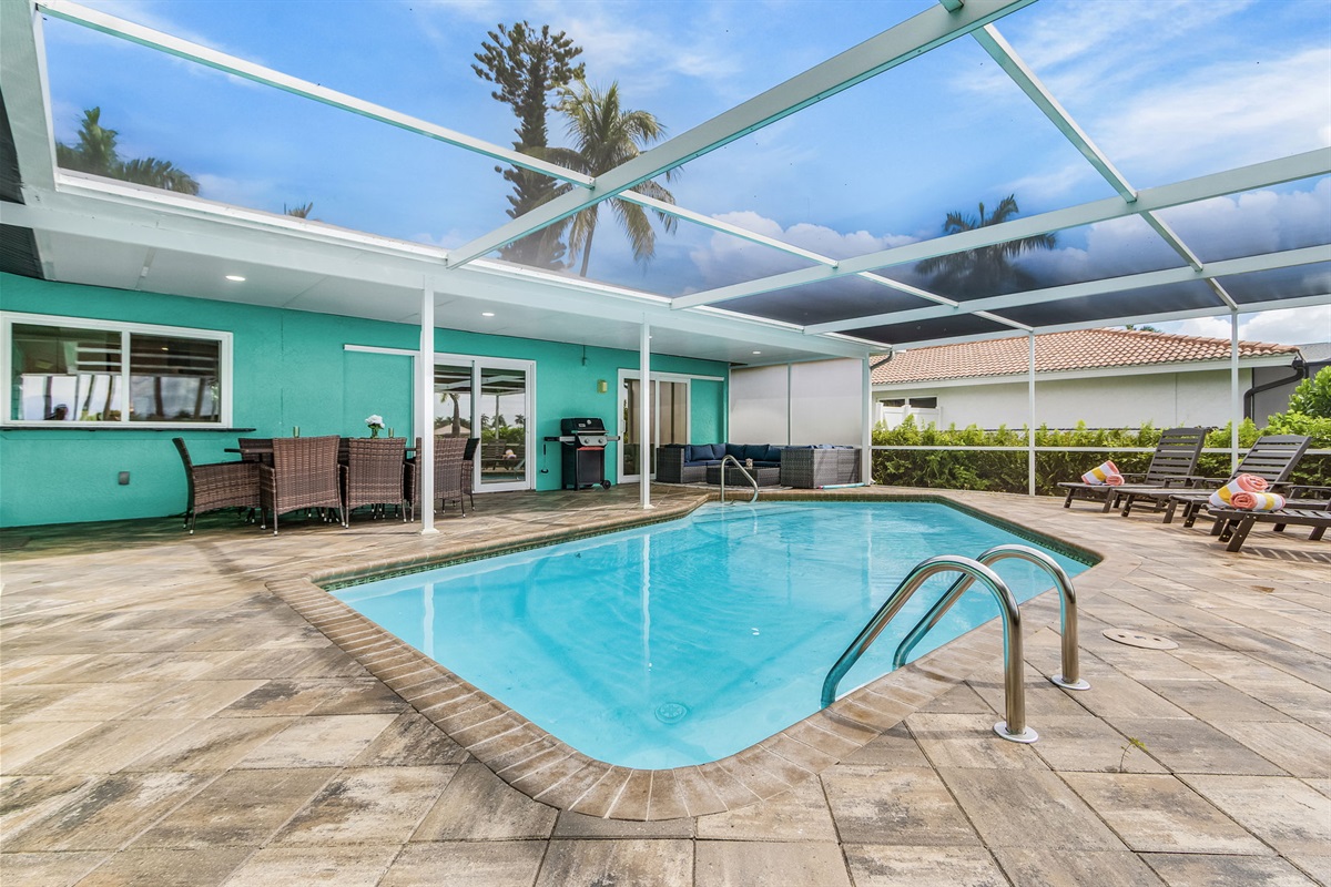Spacious lanai with plenty of lounge chairs, seating areas, and a BBQ station