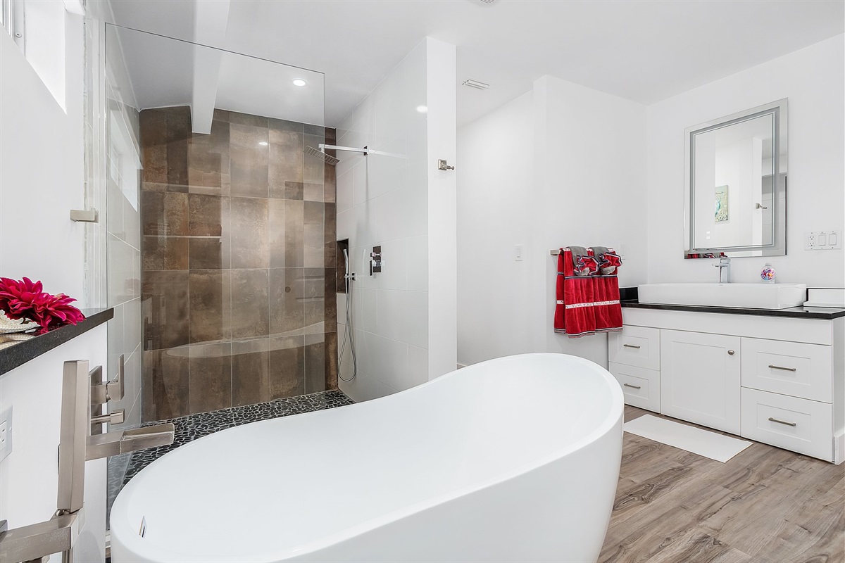Interior design, artwork and furniture collections impart the home a modern and cozy ambience. A large dining table for 8 inside and a large that seats 6 outside for your entertaining. The leather living room sectionals invites to relax and watch a movie on the large flat screen TV.