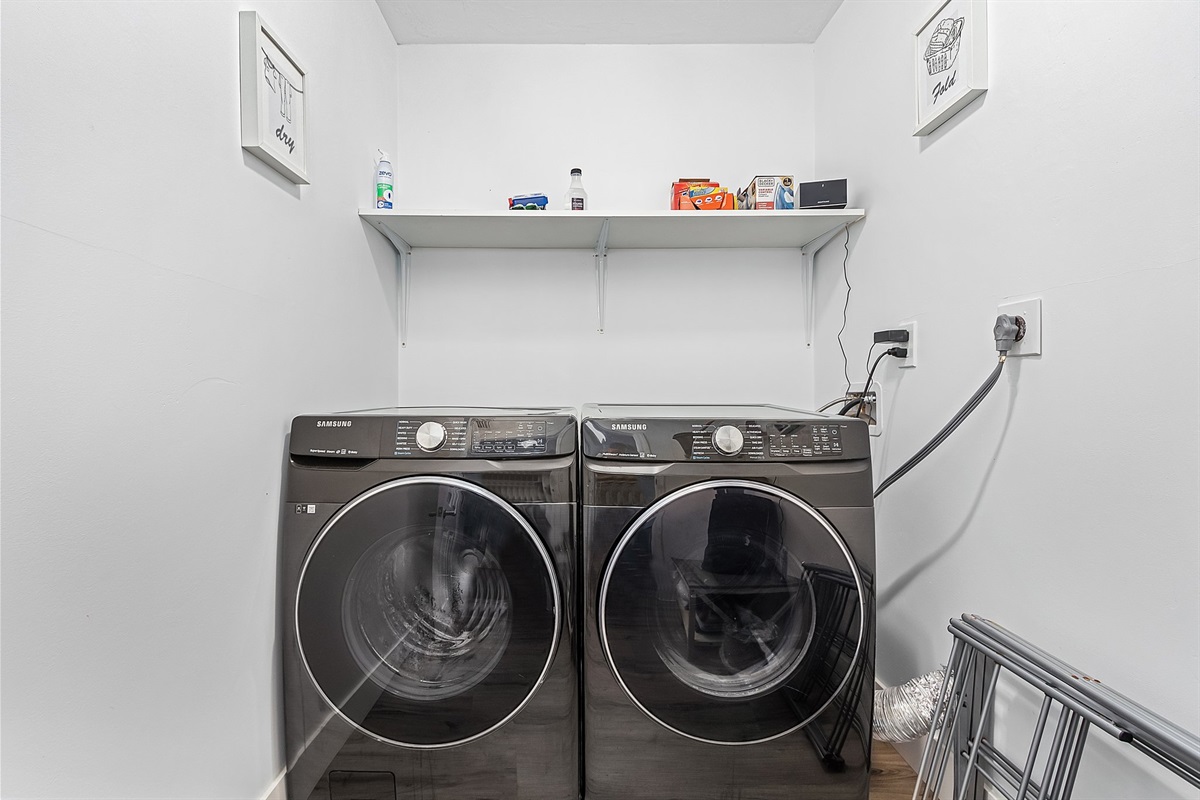 Also on the same level, laundry with washer, dryer and sink and a two-car garage.